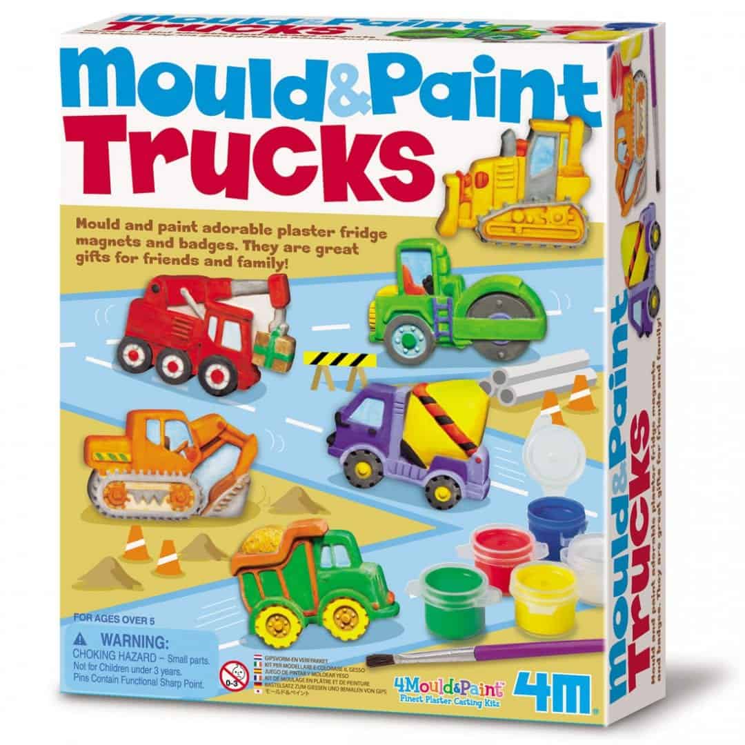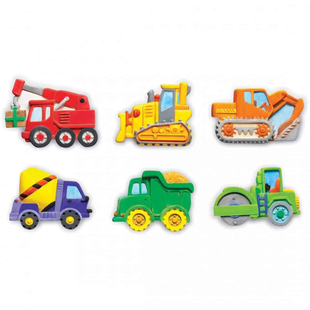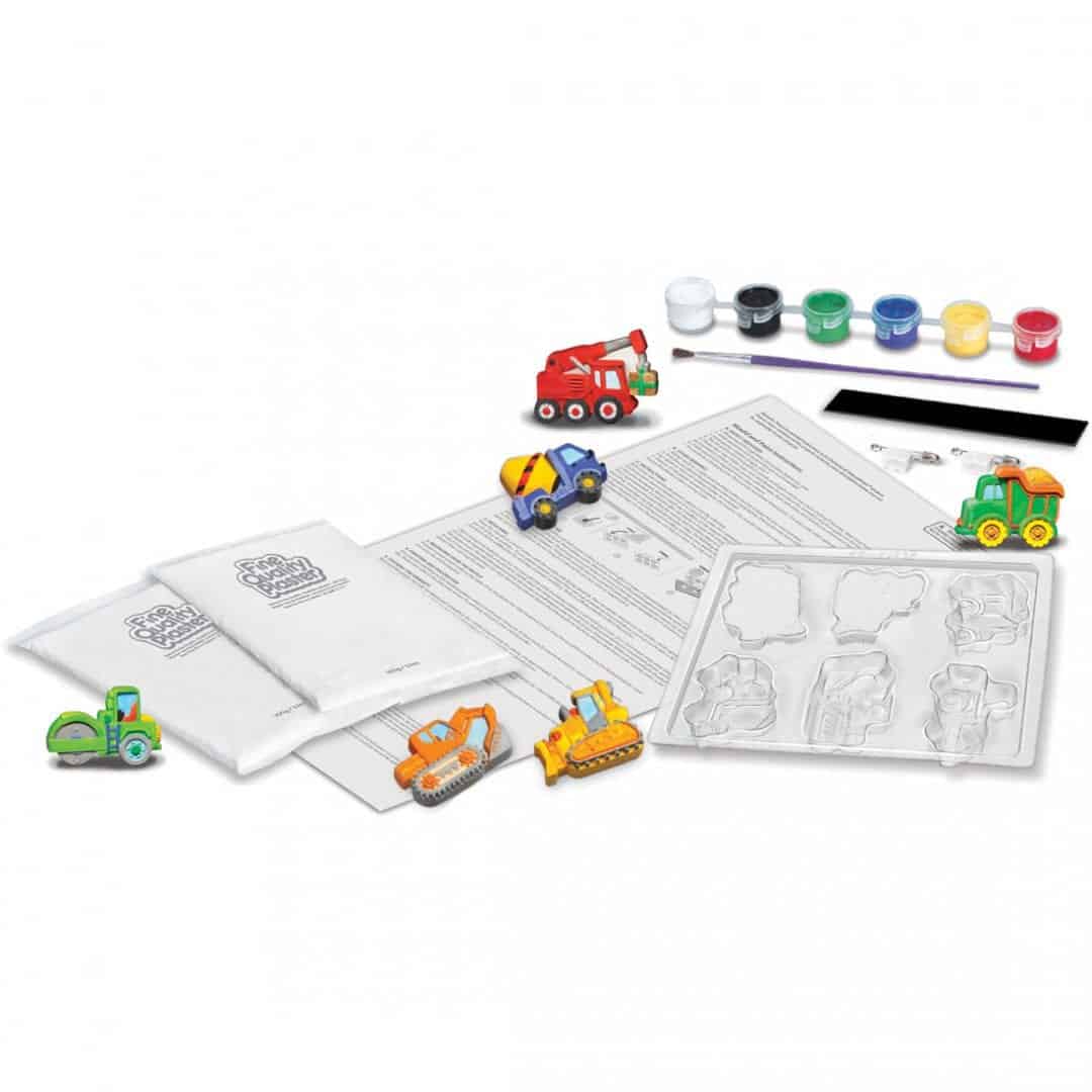 ערכת יצירה בגבס משאיות מכילה: תבנית עם 6 עיצובים, רצועת צבע, 2 צבעים זוהרים, 6 מגנטים, 6 סיכות, מברשת צביעה, גבס איכותי והוראות מפורטות.