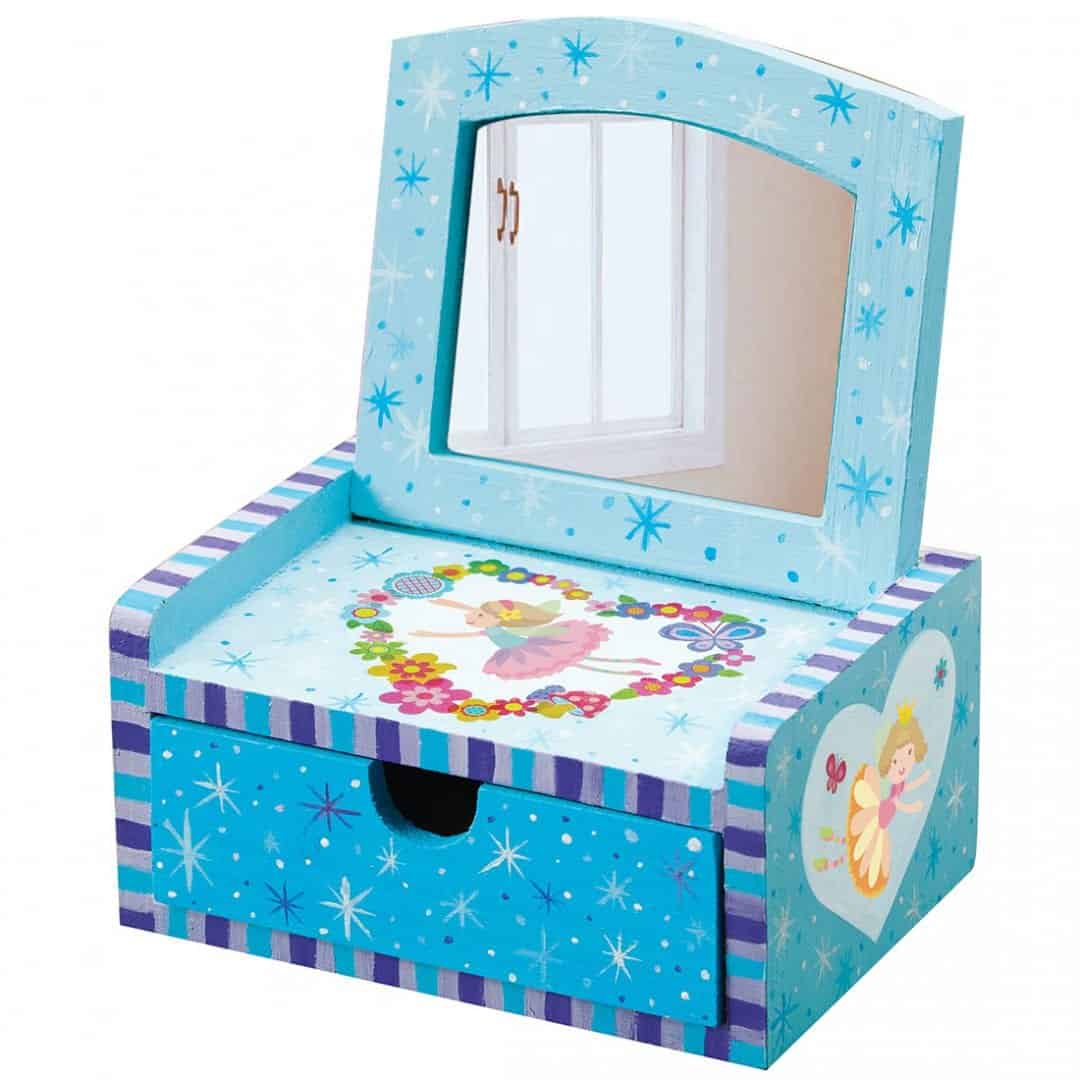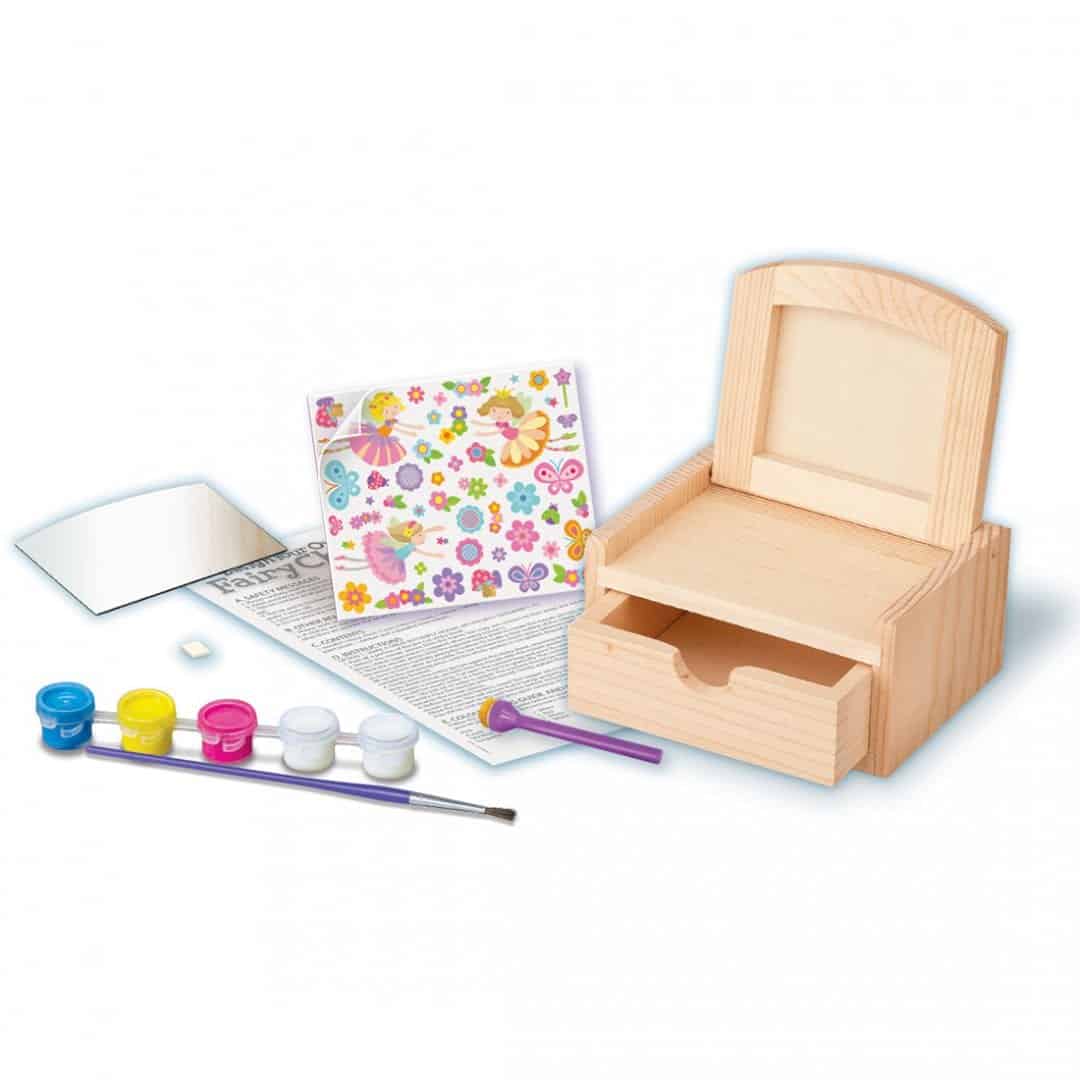 ערכת צביעת תיבת עץ פיה עם מראה מכילה: שידת עץ, מראה, רצועת צבע, מכחול, זוג כנפיים עשויות מתחרה, עלי כותרת, מנקה מקטרת, פייטים, סרט, צמר, חרוז מעץ, דבק, נייר דבק דו-צידי והוראות מפורטות. התכולה מספיקה להכנת תיבת עץ ברוחב של 12 ס”מ.